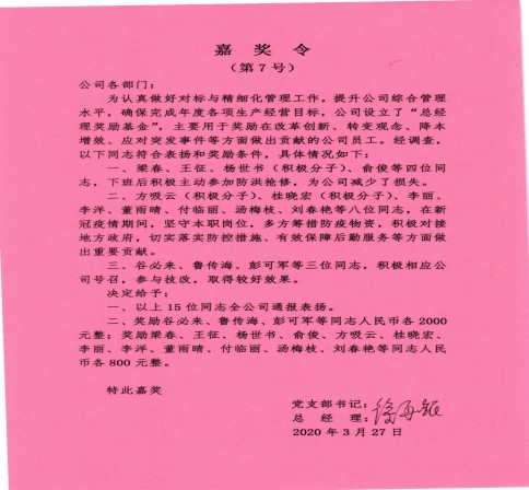 為促進企業發展,推動工作創新,公司和黨支部共同設立了獎勵基金,每年10萬元。用于獎勵在支部建設、改革創新、產品研發、降本增效、企業文化創建等方面做出貢獻的黨員與員工。例如:2018年9月24日,技術骨干、發展對象方吸云利用業余時間,解決了雷蒙磨運行中的結垢問題,獲得獎勵8000元;2020年3月22日,生產骨干、預備黨員楊世書等四人放棄休息時間,趕到公司積極參加抗洪搶險,避免公司財產造成重大損失,獲得獎勵4200元;2020年6月12日,黨員湯玲玲、預備黨員桂曉宏、入黨積極分子蔣治宏、一線員工朱維翠等9位同志主動參加無償獻血活動,獲得獎勵5800元;桂曉宏、方吸云在新冠疫情嚴重的時候,堅守崗位,吃住在公司,多方籌措防疫物資,切實落實防疫措施,保證了生產秩序的穩定,等等……。據統計,自2017年以來,公司共發放獎勵29.16萬元,獎勵62人次,其中普通黨員及一線員工占70%以上。通過實施精準獎勵,極大地調動了員工的積極性和創造性,主人翁意識不斷增強,推動了公司的業績提升,通過采取安全“負激勵”措施,公司成立至今無一例重大安全事故發生,生產經營及黨組織建設呈現良好發展態勢。2019年-2020年度,連續創造人均繳納稅收超過10萬元的佳績。