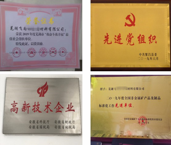 公司黨支部連續三年獲得鎮及縣級先進黨支部稱號;2019年榮獲蕪湖市“我奮斗我幸福”最佳幫扶單位及全國非金屬標準化制定工作先進單位;2020年榮獲蕪湖市“雙強六好”非公企業先進黨組織;在今年新冠疫情及防汛抗洪工作中,分別受到蕪湖市工商聯的表彰。公司多名黨員及員工受到了國家、省、市等各個級別的表彰和獎勵。