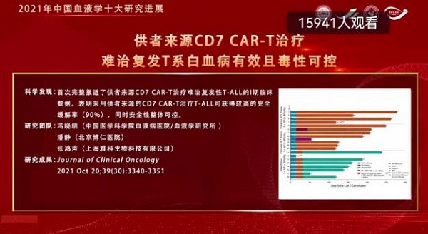 這一研究進展的科學發現是:首次完整報道了供者來源CD7 CAR-T治療難治復發性T-ALL的I期臨床數據。表明采用供者來源的CD7 CAR-T治療T-ALL可獲得較高的完全緩解率(90%),同時安全性整體可控。