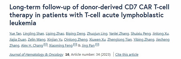 4月5日,采用雅科生物科技的CD7 CAR-T細(xì)胞治療技術(shù),由北京高博博仁醫(yī)院的潘靜主任團(tuán)隊(duì)對(duì)醫(yī)治的T細(xì)胞白血病患者進(jìn)行了長(zhǎng)達(dá)2年的隨訪,這一重要的臨床結(jié)果發(fā)表在知名學(xué)術(shù)期刊《Journal of Hematology & Oncology》(影響因子23.168)上:Long-term follow-up of donor-derived CD7 CAR T-cell therapy in patients with T-cell acute lymphoblastic leukemia1。